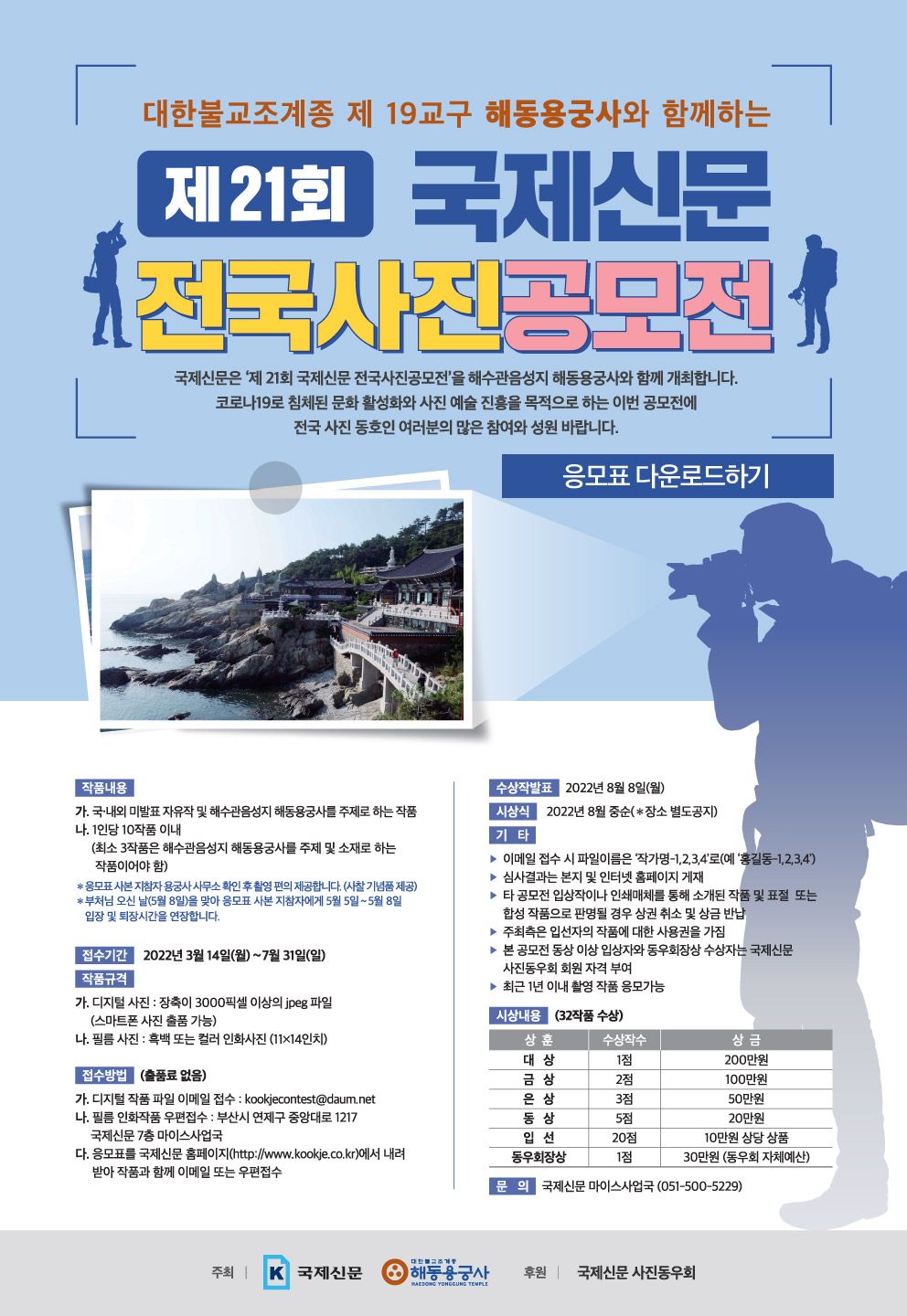 국제신문은 `제 21회 국제신문 전국사진공모전`을 해수관음성지 해동용궁사와 함께 개최합니다. 코로나19로 침체된 문화 활성화와 사진 예술 진흥을 위한 이번 공모전에 전국 사진 동호인 여러분의 많은 참여와 성원 바랍니다.