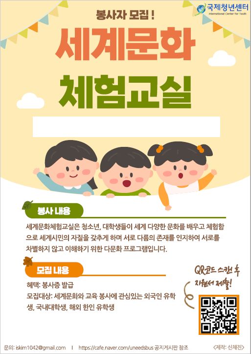 서울, 부산, 부천에 있는 지역아동센터에게 다양성, 다문화 체험 프로그램을 운영하고자 하는 유학생과 대학생 봉사자를 모집합니다.