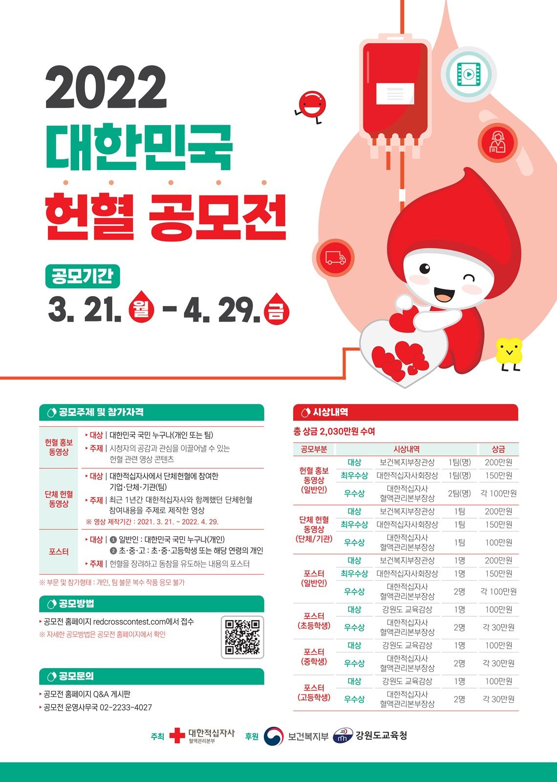- 일반인 최우수상 1명 150만원 대한적십자사 회장상