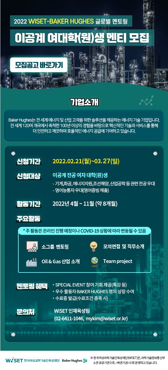 * 본 멘토링은 한국여성과학기술인육성재단과 Baker Hughes가 함께하는 WISET-Baker Hughes 글로벌 멘토링입니다❤