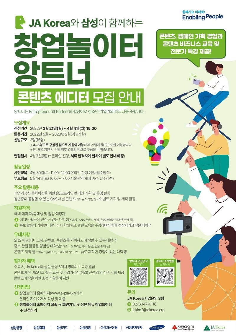 JA Korea와 삼성 금융 6개사, 사랑의 열매가 함께하는 청소년 기업가정신 함양 교육 <창업놀이터>에서 대학생 에디터를 찾습니다!! 콘텐츠/캠페인/이벤트 기획 에디터 활동을 더불어, 콘텐츠 전문가 교육을 받고 싶다면 아래 링크를 확인하세요!