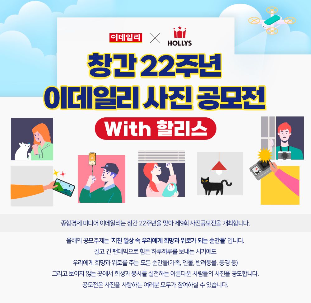 종합경제 미디어 이데일리는 창간 22주년을 맞아 제9회 사진공모전을 개최합니다. 올해의 공모주제는 '지친 일상 속 우리에게 희망과 위로가 되는 순간들'입니다. 길고 긴 팬데믹으로 힘든 하루하루를 보내는 시기에도 우리에게 희망과 위로를 주는 모든 순간들 그리고 보이지 않는 곳에서 희생과 봉사를 실천하는 아름다운 사람들의 사진을 공모합니다. 많은 참여 부탁드립니다.