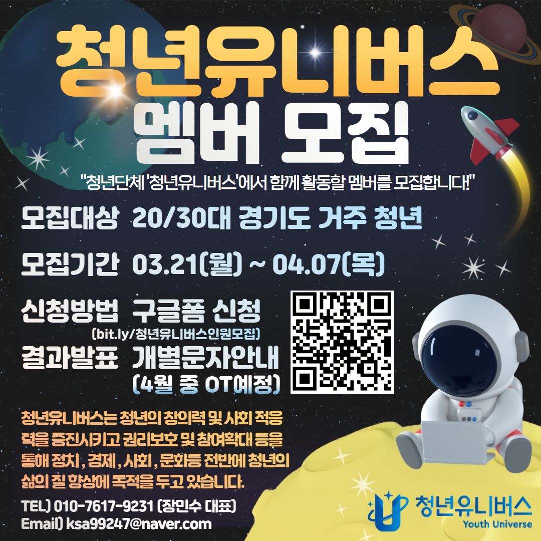 -신청방법 : 구글폼 신청(bit.ly/청년유니버스인원모집) 또는 QR코드 스캔 후 내용 작성
