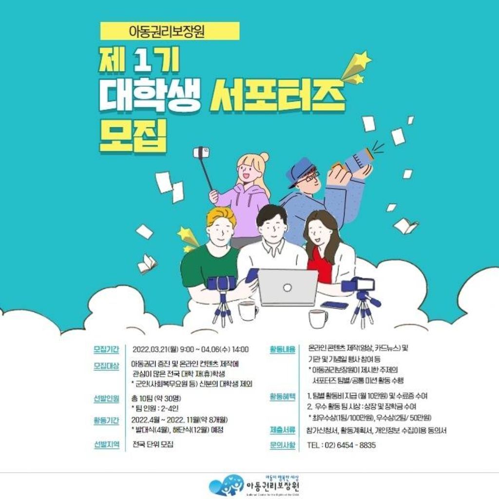 아동권리 증진 및 기관 인지도 제고를 위한 제 1기 대학생 서포터즈를 다음과 같이 모집할 예정입니다.