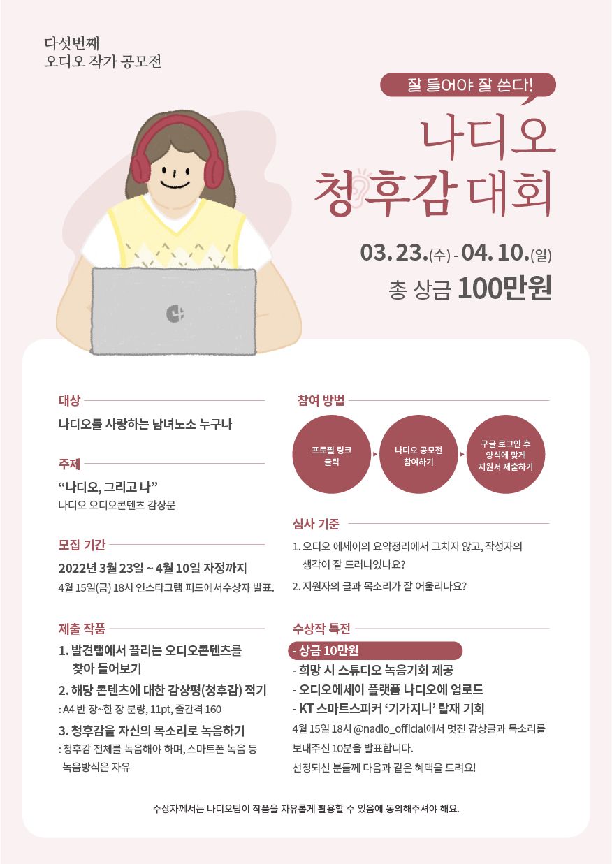 힐링 오디오에세이 플랫폼 나디오에서 《전국민 나디오청(👂)후감 대회》를 개최합니다. 나디오 오디오에세이를 통해 어떻게 위로받고 있는지, 또 어떤 콘텐츠를 재미있게 들으셨는지 궁금합니다.