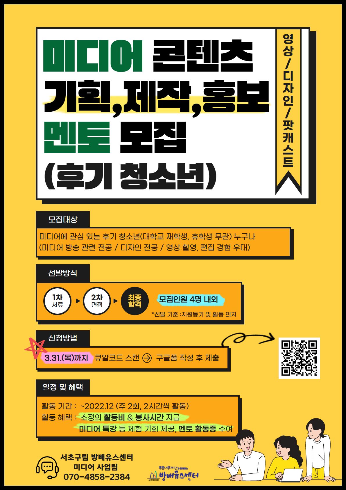 : 서초구립 방배유스센터 미디어사업팀 02-3487-6161(내선602) / 070-4858-2384