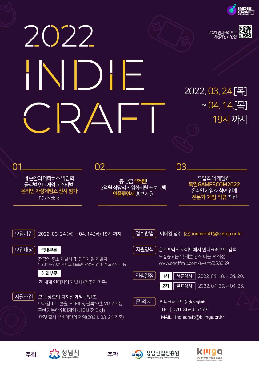 - 선정혜택 : 인디크래프트 온라인 가상게임쇼 참가 / 총 1억원의 상금