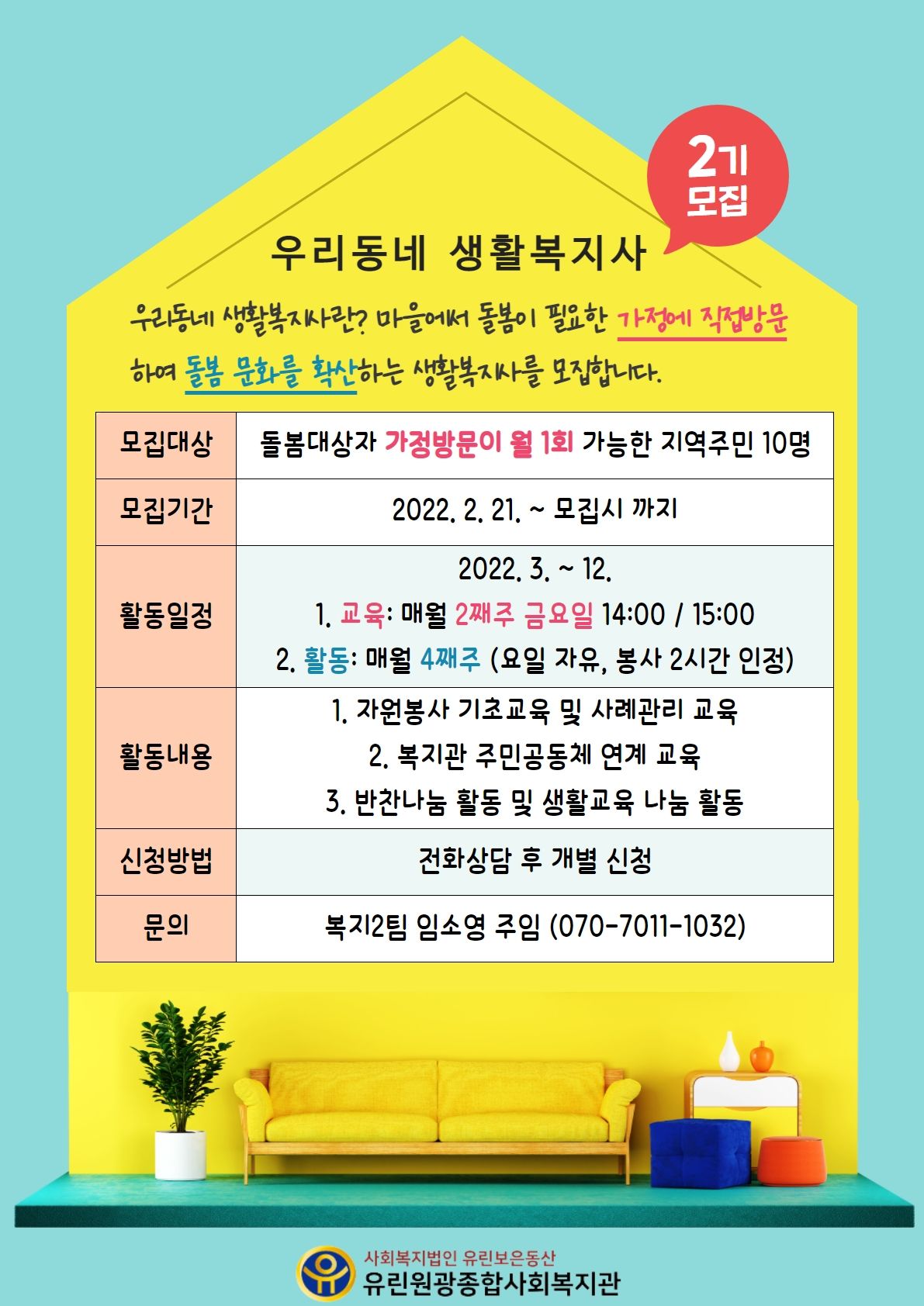신청방법: 첨부파일에 있는 생활복지사 신청서 작성 후 이메일 전송 혹은 070-7011-1032 유선 전화 상담