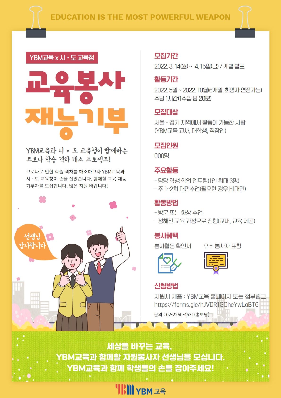 세상을 바꾸는 교육, YBM교육에서 교육봉사 재능기부자를 모십니다.