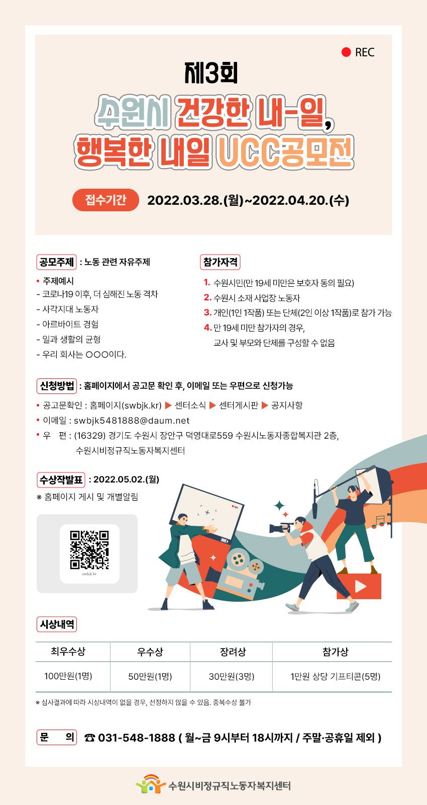 3) 우 편 : 경기도 수원시 장안구 덕영대로559 수원시노동자종합복지관 2층 수원시비정규직노동자복지센터 공모전 담당자 앞