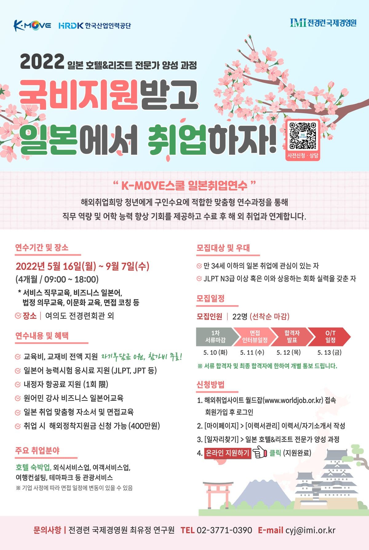 2022년 전경련 IMI 일본 호텔&리조트 전문가 양성과정은 한국산업인력공단에서 예산을 지원받아 운영되는 과정으로 경제인연합회 글로벌 회원사에서 요구하는 인재를 선발하여 약 4개월 간의 직무교육, 비즈니스일본어, 일본현지정착교육, 이문화 교육 등을 통해 글로벌 인재로 양성시키는 프로그램입니다.