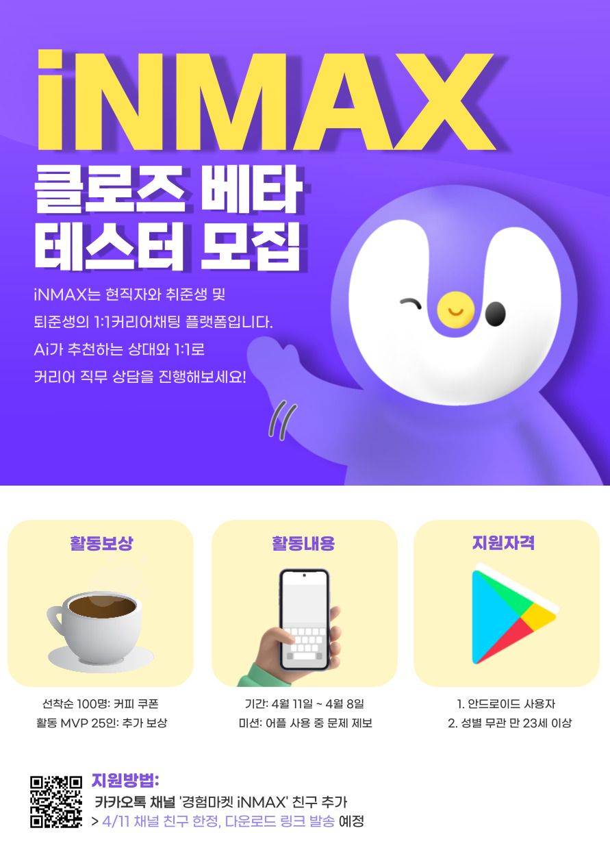 🐧AI펭귄 맥스와 누구보다 먼저 iNMAX앱을 탐험할 베타 테스터를 구합니다🐧
