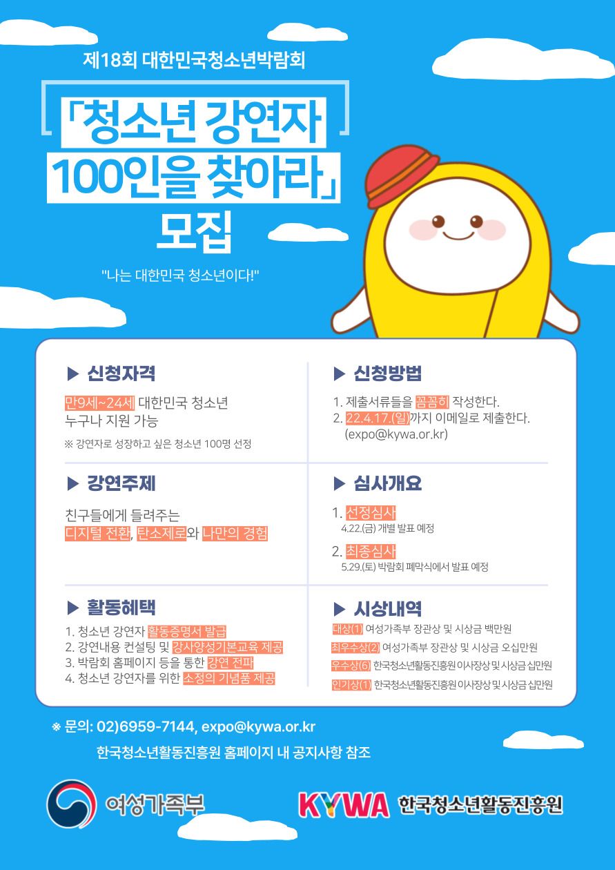 제18회 대한민국청소년박람회 및 청소년활동에 대한 청소년의 관심과 참여 활성화를 위하여 다음과 같이 세상을 향한 청소년들의 당당한 외침, 「나는 대한민국 청소년이다!」에 참여할 청소년 강연자 100명을 모집합니다.