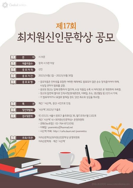 - 우)03131 서울시 종로구 율곡로6길 36, 월드오피스텔 1102호, 계간 『시산맥』 내 <최치원신인문학상> 운영위원회