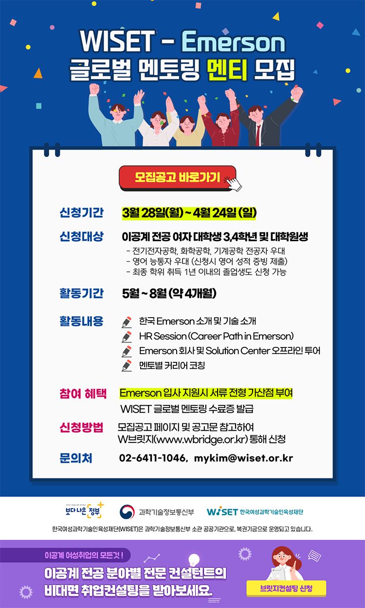 「WISET-Emerson 글로벌 멘토링」 멘티를 아래와 같이 모집 하오니