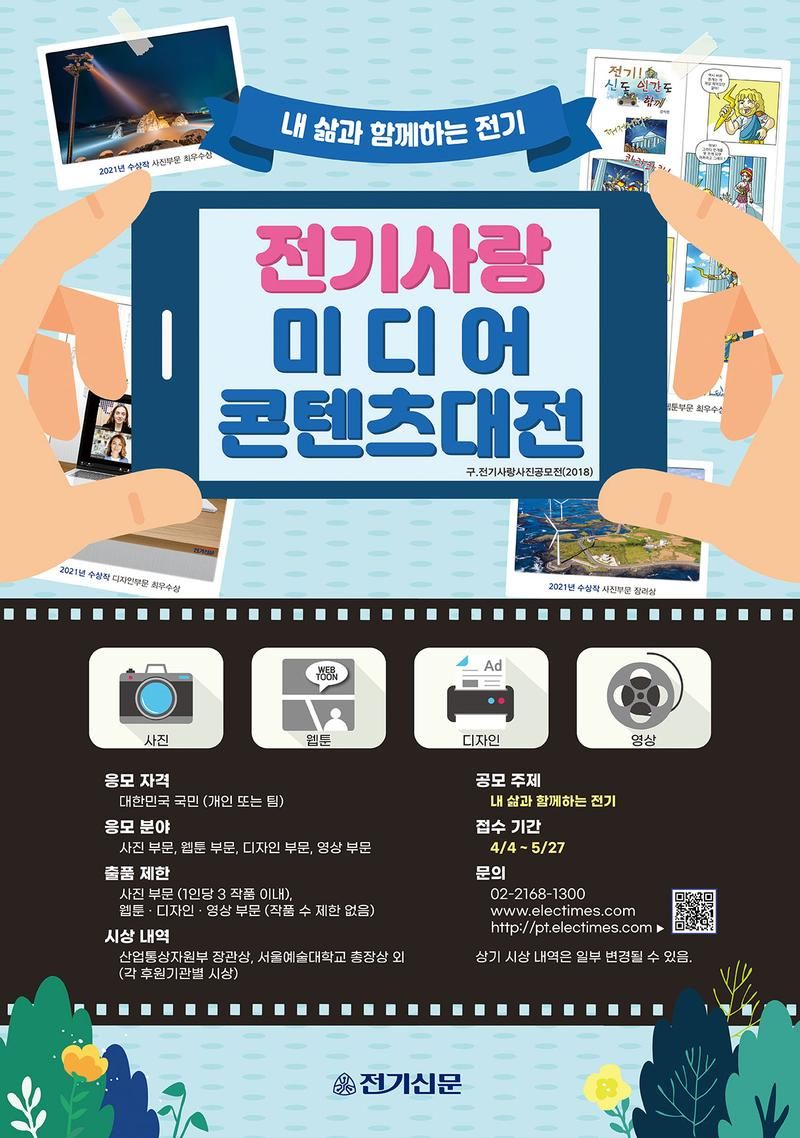 전기신문이 우리 생활 속에 전기와 함께하는 삶, 전기의 소중함과 고마움, 전기 사랑 등을 다양한 콘텐츠에 표현하며 전기의 고마움과 소중함을 다시 한번 되새기고, '전기사랑! 나라사랑!'을 실천하는 동기를 부여함으로써 전기문화 창달에 기여할 초석을 마련코자 미디어콘텐츠대전을 개최합니다.