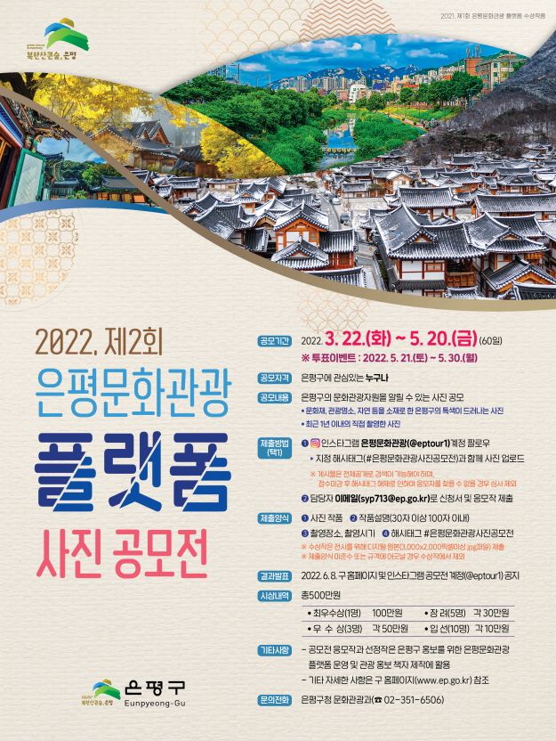 은평구의 자연환경 및 문화·관광 자원을 주제로 은평구의 다양한 매력을 소개할 수 있는「제2회 은평문화관광 플랫폼 사진 공모전」을 아래와 같이 개최하오니, 관심 있는 분들의 많은 참여를 바랍니다.