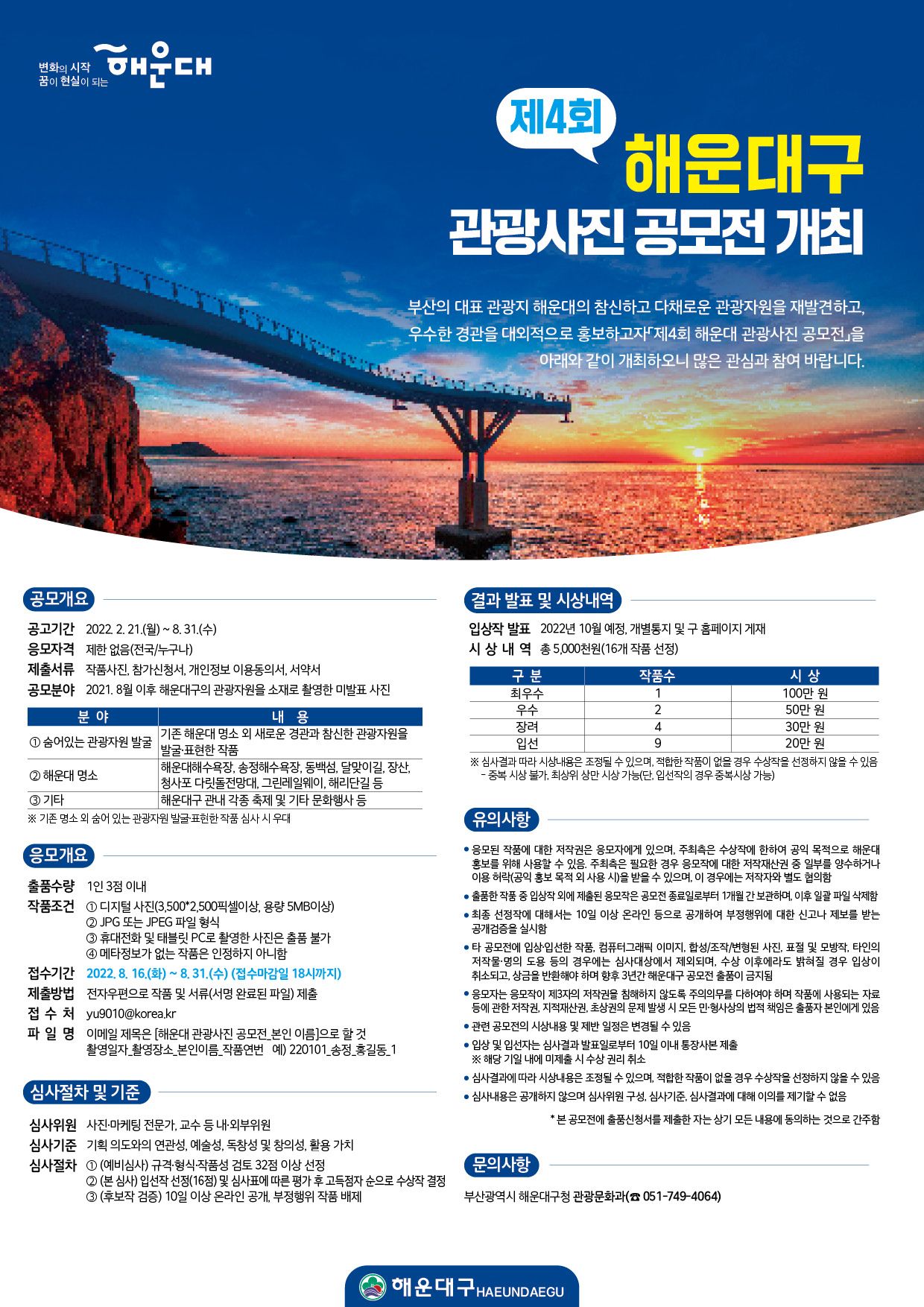 부산의 대표 관광지 해운대의 참신하고 다채로운 관광자원을 재발견하고 우수한 경관을 대외적으로 홍보하고자 『제4회 해운대 관광사진 공모전』을 아래와 같이 개최하오니, 많은 관심과 참여 바랍니다.