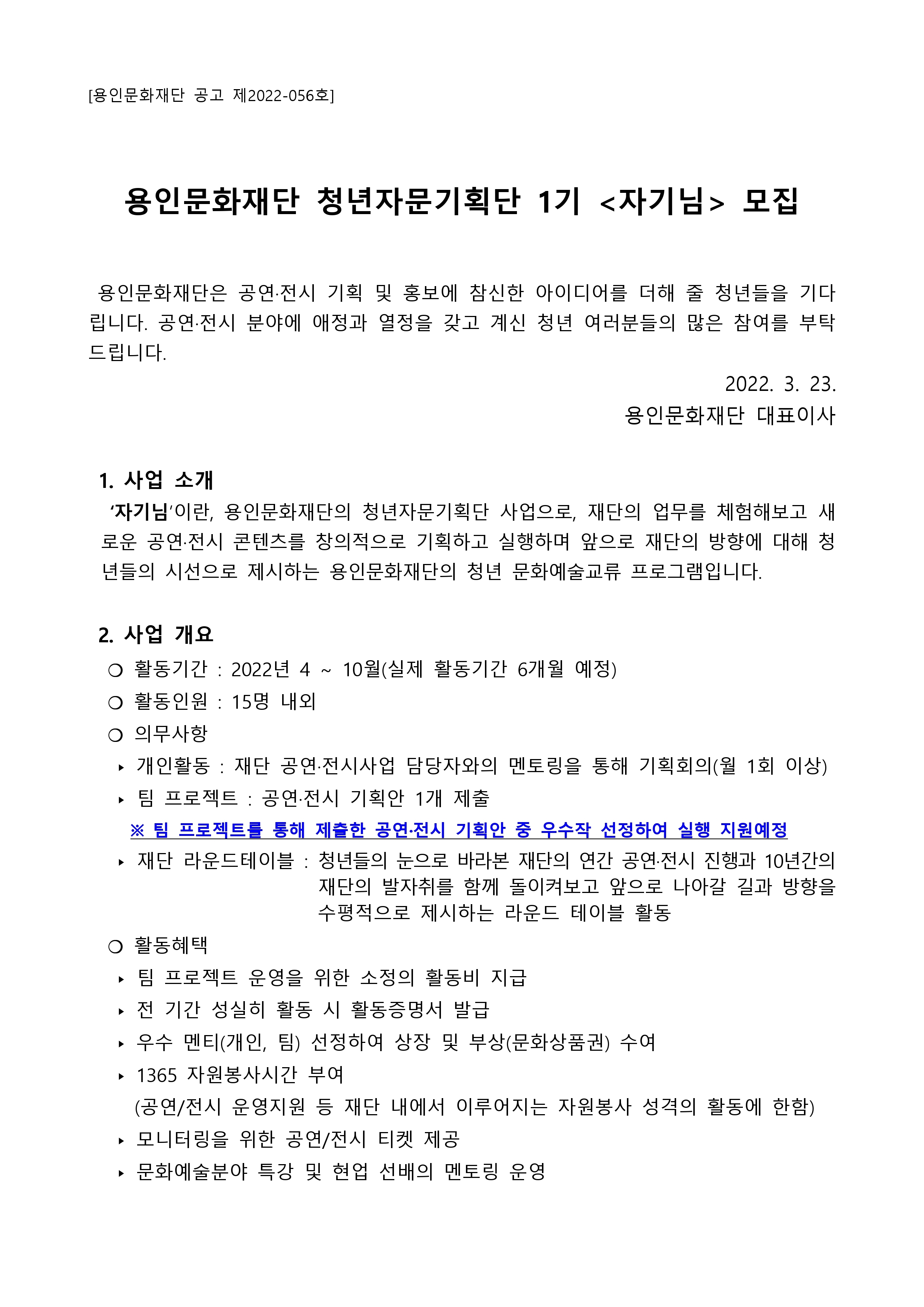 2022 용인문화재단 청년자문기획단 <자기님> 1기 참여자 모집