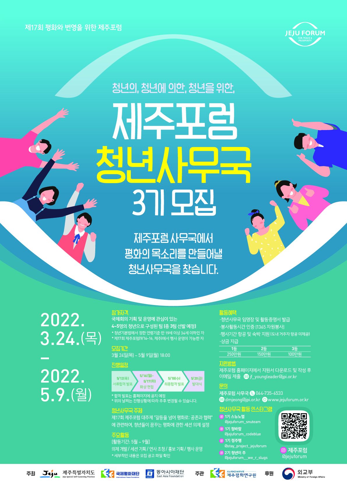 - 제17회 제주포럼 대주제 "갈등을 넘어 평화로: 공존과 협력"에 관련하여, 청년들이 꿈꾸는 평화에 관한 세션 의제 설정
