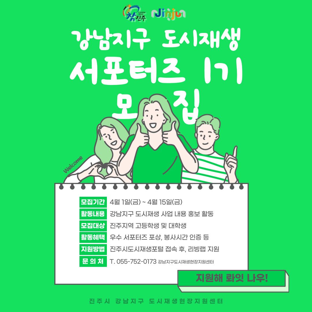 저희 진주시 강남지구의 매력을 쏙쏙 발굴하여 홍보 활동을 해주실 고등학생 대학생분들을 찾고 있습니다!