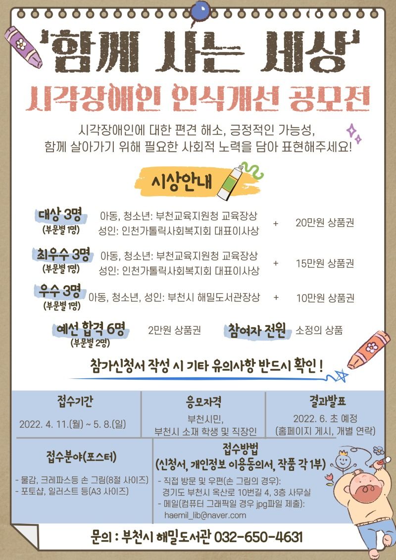 부천시 해밀도서관에서는 시각장애인에 대한 사회적 관심 증대 및 인식개선을 위해 ‘포스터’ 공모전을 진행하고자 합니다. 많은 신청 바랍니다.