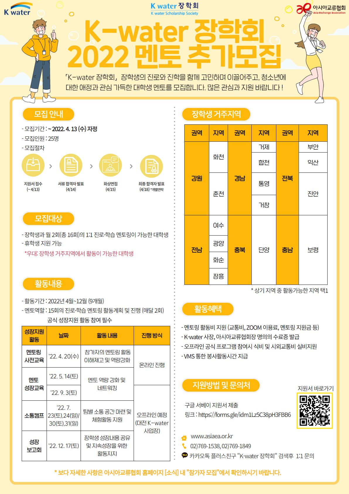 [아시아교류협회] K-water 장학회 2022 멘토 추가모집(~4/13)