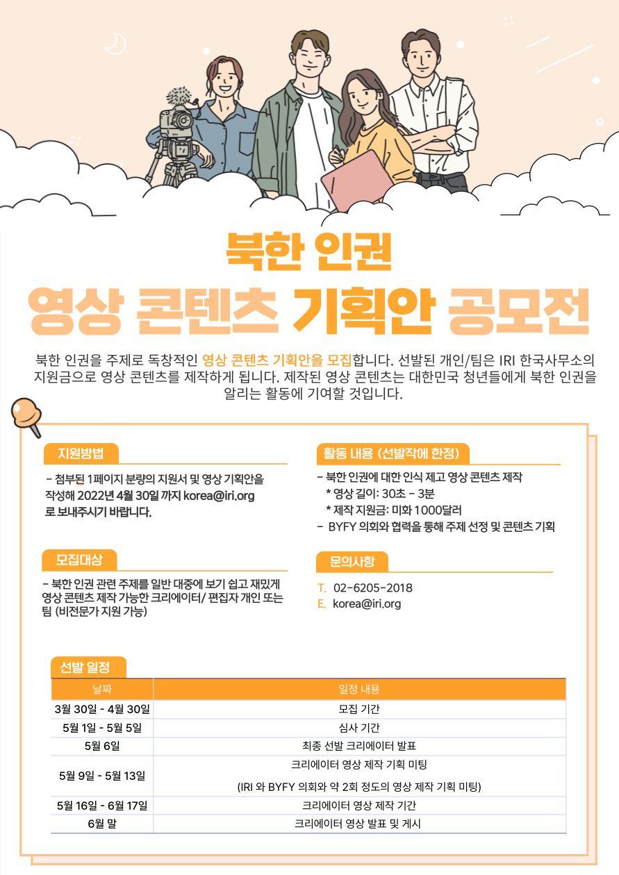 북한 인권을 주제로 독창적인 영상 콘텐츠 기획안을 모집합니다. 선발된 개인/ 팀은 IRI 한국사무소의 지원금으로 영상 콘텐츠를 제작하게 됩니다. 제작된 영상 콘텐츠는 대한민국 청년들에게 북한 인권을 알리는 활동에 기여할 것입니다.