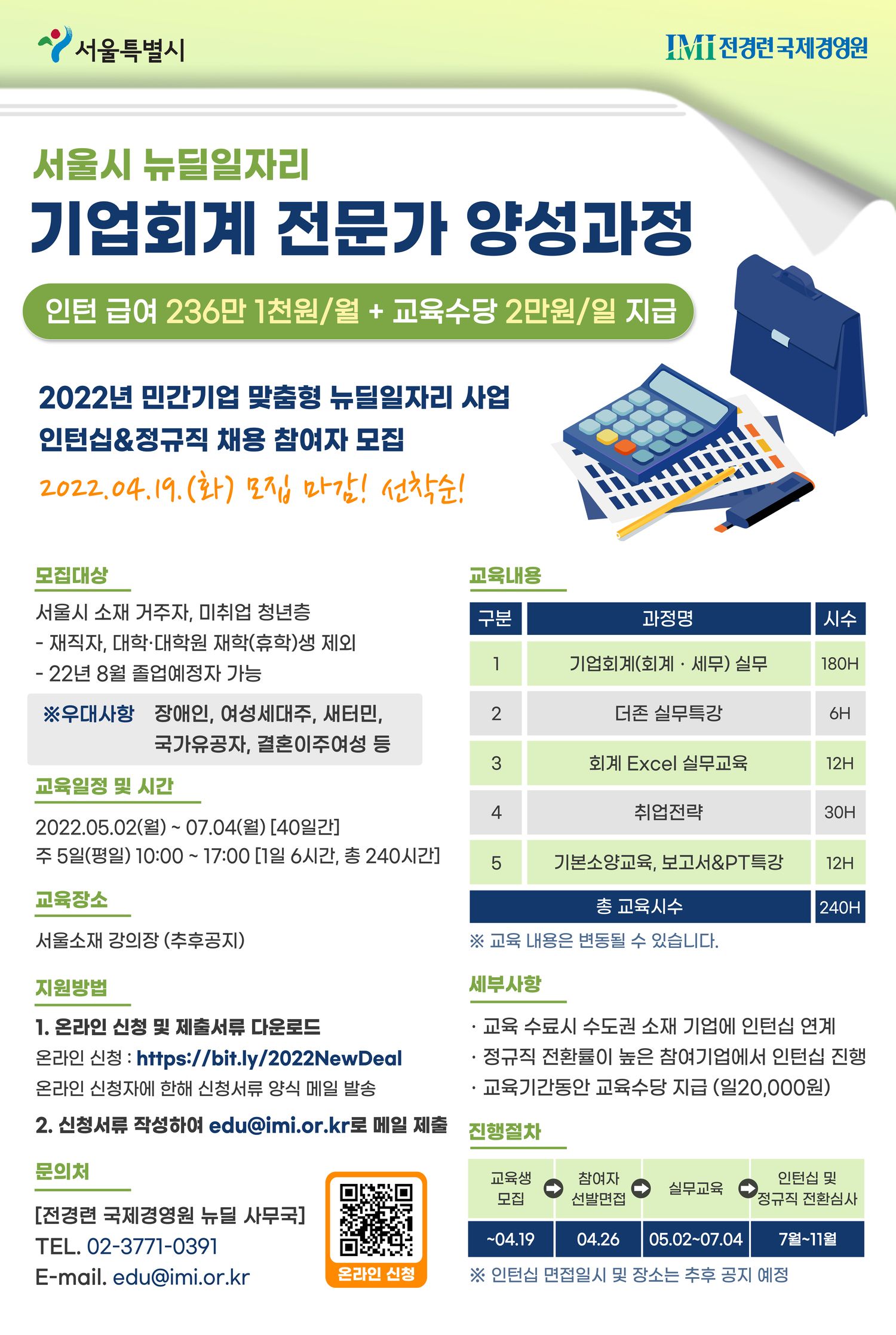 (사)국제경영원이 2022년 민간기업 맞춤형 뉴딜일자리 사업을 진행함에 따라 경영지원 직무로 진로를 희망하는 서울시 거주 청년들에게 경영지원 실무교육을 제공하고 기업과의 인턴십 및 정규직 전환을 연계하는「기업회계 전문가 양성과정」 참여자를 아래와 같이 모집합니다.