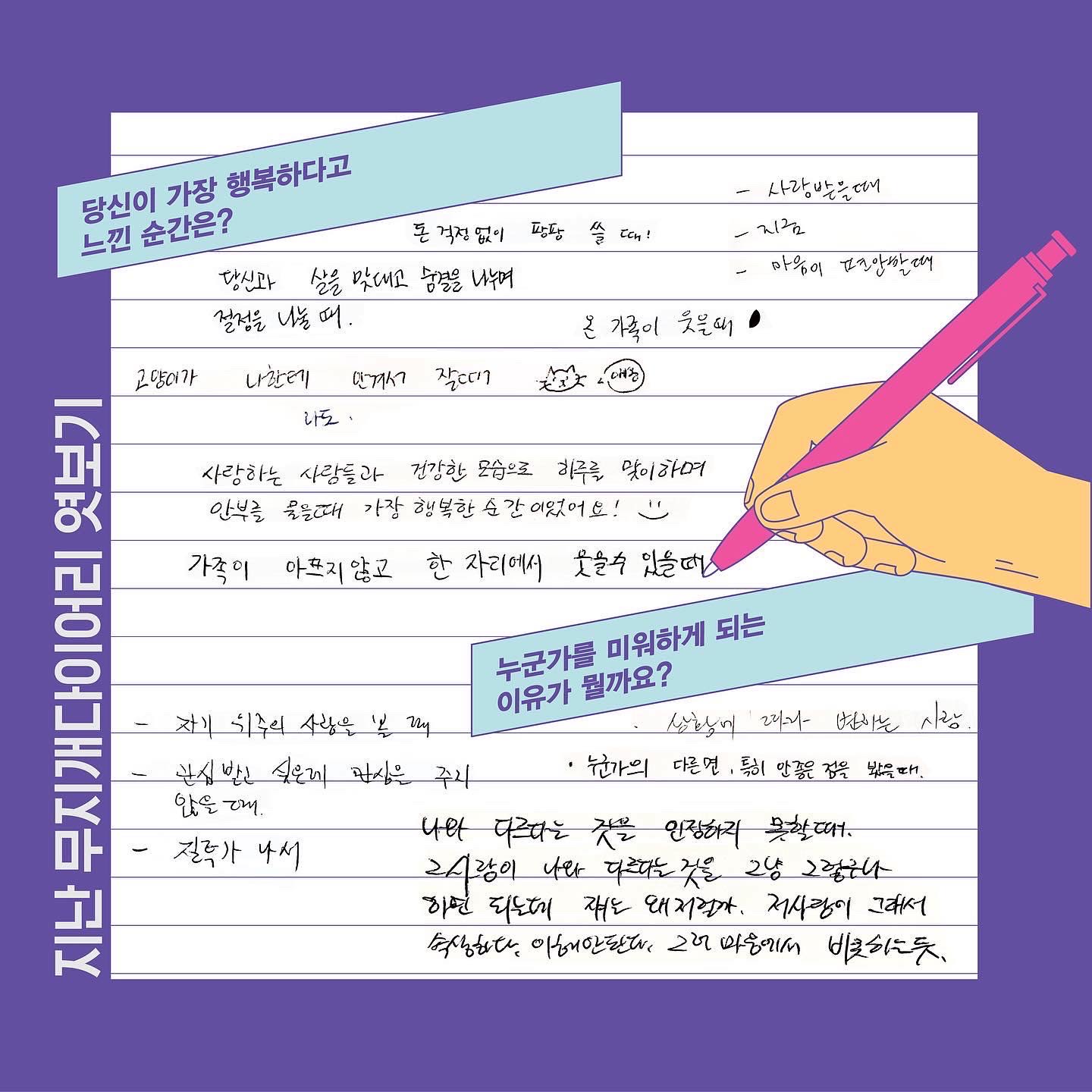 사진을 보시면 지난 2년간 곳곳의 일상공간에 뿌려졌던 무지개다이어리에 남겨진 질문과 답변 중에 뽑아보았어요. 어쩌면 자신이 가장 답해보고 싶은 질문을 던지고, 질문을 받은 사람은 누군지도 모르는 사람들에게 많은 위로를 전해주는 이 따뜻한 무지개다이어리에 애정이 참 많습니다. 이번에는 영등포에 가능한 모든 빨래방에 무지개다이어리를 놓아두려고해요. 담길 질문을 함께 만들고 싶어요🌈