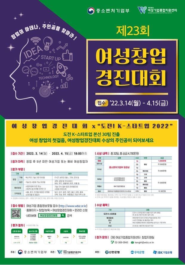 - 2022년 여성창업경진대회에 참가하여 중기부장관상 수상과 도전 K-스타트업 왕중왕전 수상, 일석이조 기회를 얻으시길 기원합니다.