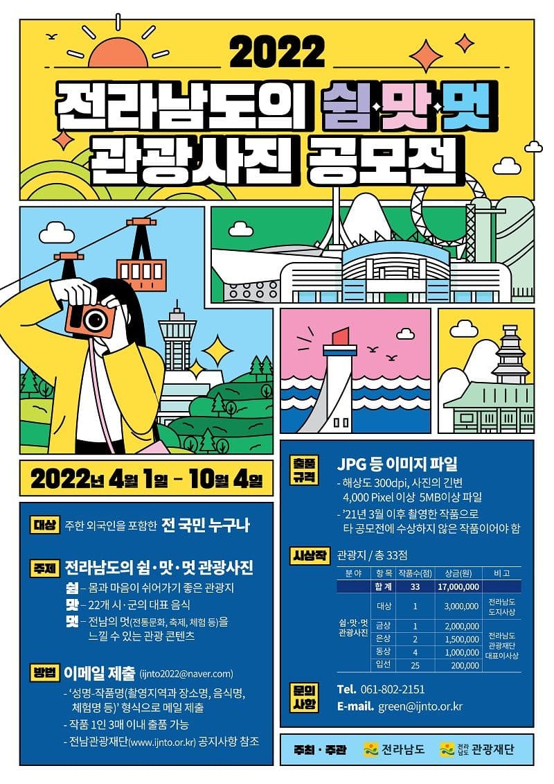 전라남도의 우수한 관광 사진 자료확보와 도내 관광 인지도의 제고를 위해 『2022 전라남도의 쉼‧맛‧멋 관광사진 공모전』을 다음과 같이 공고하니 많은 관심과 응모 바랍니다.