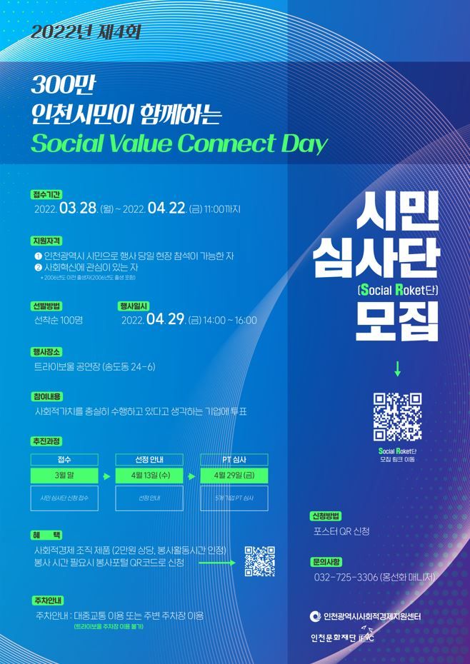 [모집] 2022년 제4회 300만 인천시민이 함께하는 Social Value Connect Day 시민심사단(Social Roket단!) 모집 안내(~4/22)