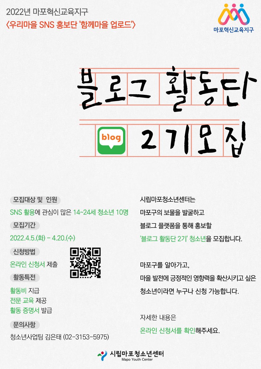○ 유스나루는 2022년 마포혁신교육지구 사업 중 하나인 [우리마을 SNS 홍보단 '함께 마을 업로드'] 활동 중 하나인 블로그활동단 2기 청소년을 모집합니다.