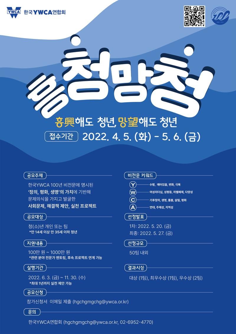 한국YWCA 100주년을 맞이하여, ‘청년들이 흥하고, 청년들이 소망하는’ 세상을 위해, 청년들이 관심을 갖고 해결하고자 하는 우리 사회의 다양한 문제들을 YWCA가 함께 지켜보고 물심양면으로 지원하고자 합니다.