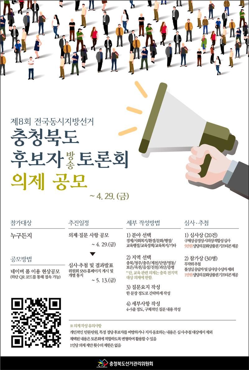 충청북도선거방송토론위원회에서는 제8회 전국동시지방선거의 충청북도지역 후보자가 후보자 방송토론회에서 토론할 논제를 공모하고 있습니다. 우리 지역 관련 의제에 대한 후보자의 의견을 방송에서 들어볼 수 있는 기회! 지금 참여해 보세요.
