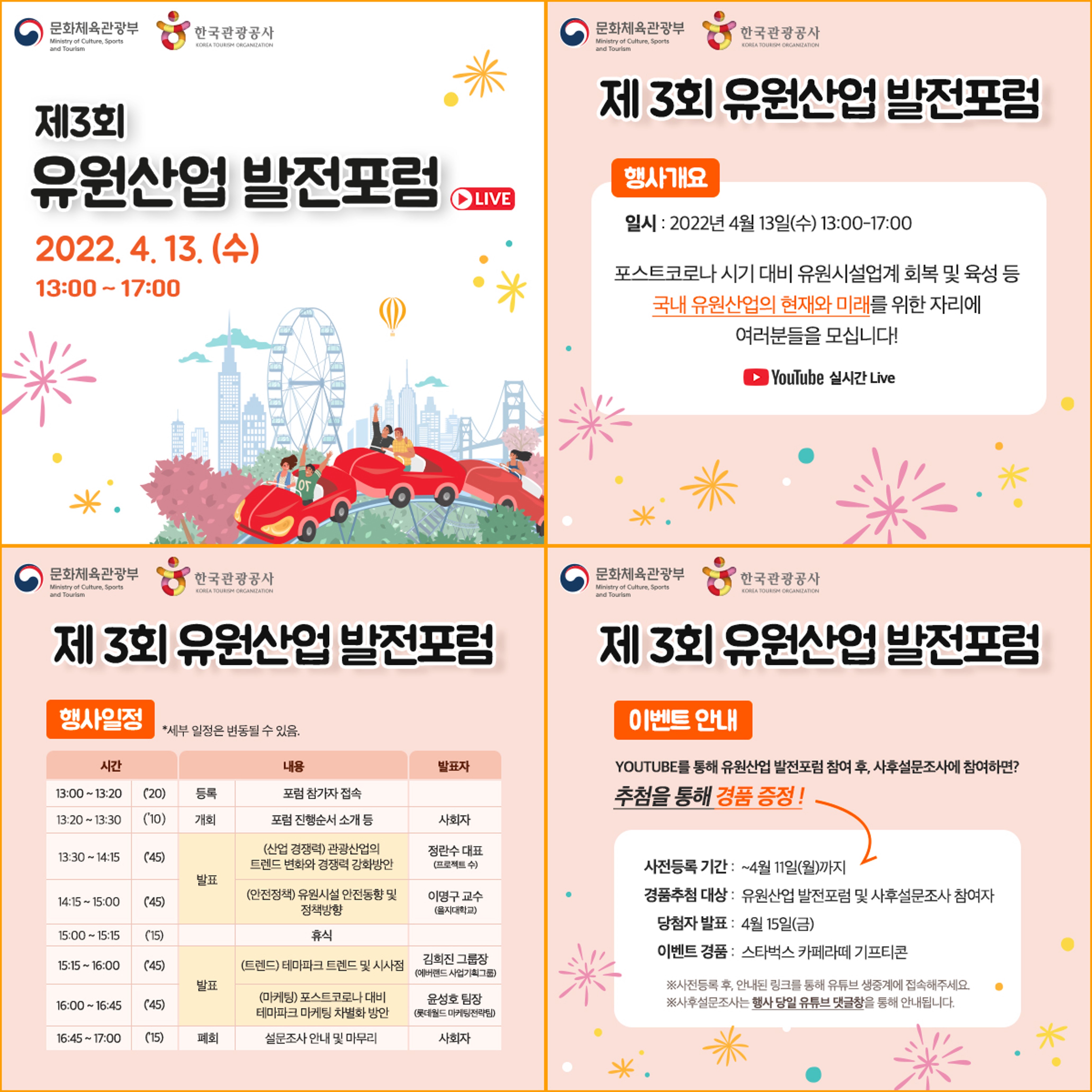 제3회 유원산업 발전포럼은 문화체육관광부와 한국관광공사가 주최, 주관하며 오는 4월 13일(수) 온라인으로 개최됩니다. 포스트코로나 시대 유원시설업계의 회복 및 경쟁력 강화방안을 모색하는 논의의 장이 되고, 산업 내 다양한 이해관계자들의 네트워킹을 위한 자리입니다.