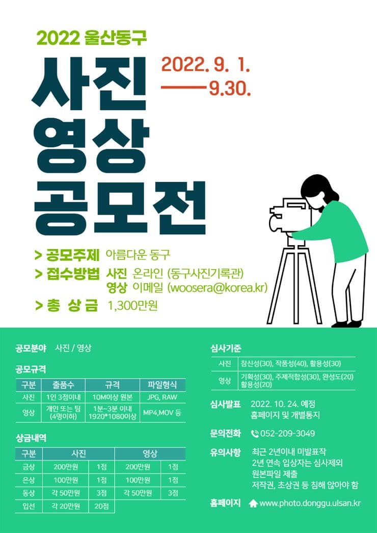 울산 동구는 천혜의 우수한 자연경관을 알리고자 ‘2022 울산동구 사진·영상공모전’을 개최하오니 많은 참여를 바랍니다.