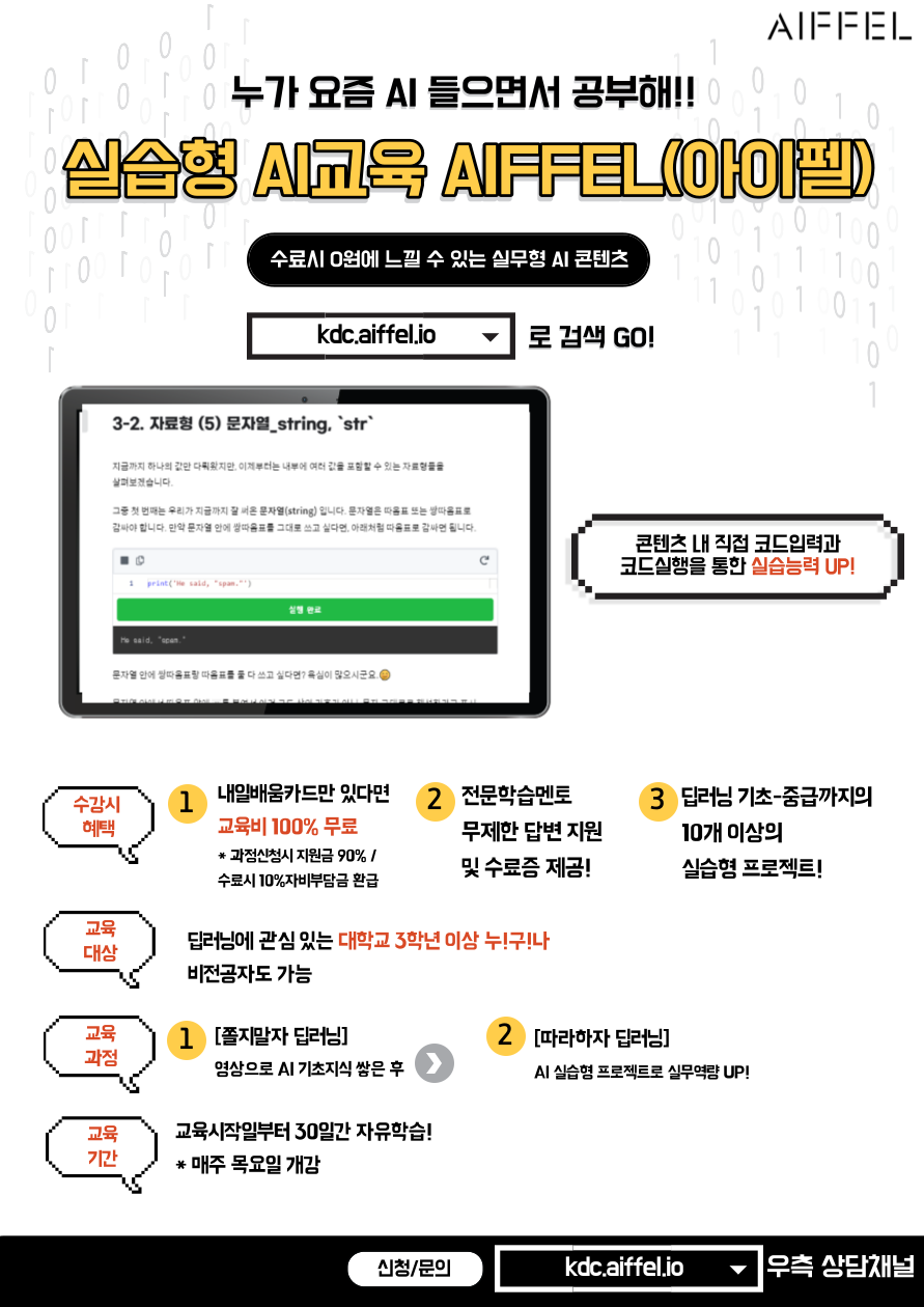 - 수료 시, 교육비 0원 (국민내일배움카드 발급을 통해 교육비 90% 국비지원, 자비부담금 10%도 수료 시 100% 전액환급)