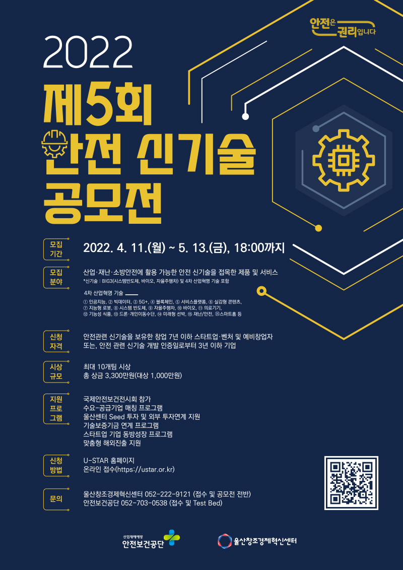 안전보건공단과 울산창조경제혁신센터는 기존 안전산업 제품과 차별화된 혁신적인 안전 신기술을 보유한 스타트업·벤처 및 예비창업자를 발굴하여 육성·지원하기 위해 다음과 같이「제5회 안전 신기술 공모전」을 개최하오니 많은 참여 바랍니다.