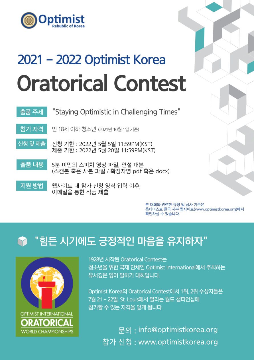 대회 규정 및 심사 기준은 www.optimistkorea.org에서 확인하실 수 있습니다.