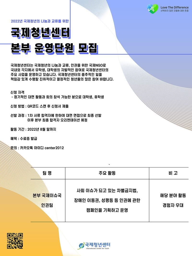 국제청년센터 국내외 지부가 늘어나면서 지부 간의 협력, 지역과 상관없이 추진되는 사업을 관리, 운영하기 위해 본부를 두게 되었으며 본부 및 지부 운영단을 추가 모집합니다.