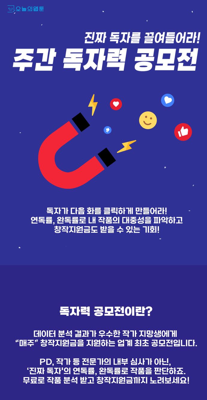 데이터 분석 결과가 우수한 작가 지망생에게 “매주” 창작지원금을 지원하는 업계 최초 공모전을 개최합니다.