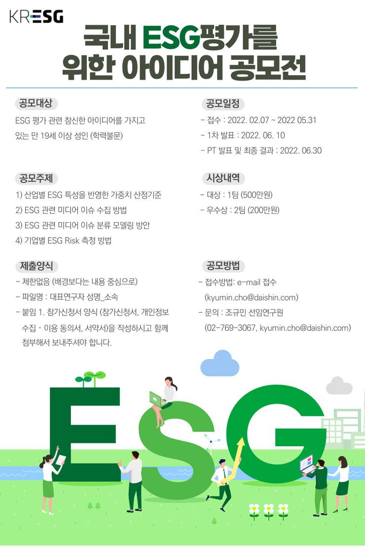 ㈜한국ESG연구소 & 대신경제연구소에서는 국내 ESG평가를 위한 아이디어 공모전을 개최하오니, 관심 있는 분들의 많은 참여 바랍니다.