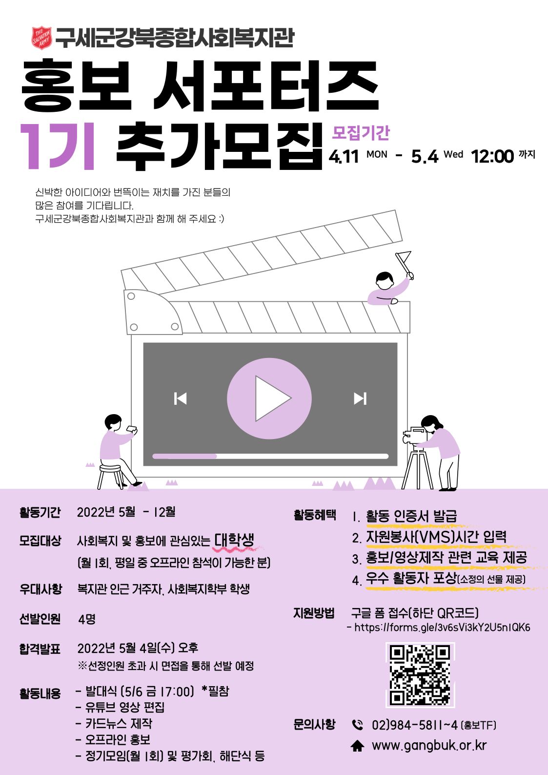 - 서울 강북구 삼양동에 위치한 구세군강복종합사회복지관에서는 지역주민에게 복지관 및 복지사업을 소개하여 우리동네에 더 많은 지역주민이 복지관을 이용하도록 하기 위해 홍보사업을 진행하고 있습니다. 올해 처음으로 복지관에서 시행하는 ‘홍보서포터즈 1기’ 열정 가득한 대학생 여러분들의 많은 지원을 기대합니다! 구세군복지관과 함께 해 주세요 !