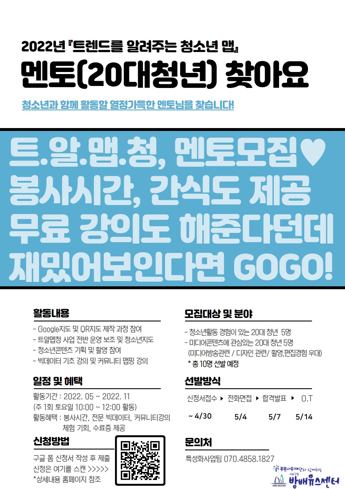 서초구립방배유스센터에서 "트렌드를 알려주는 청소년 맵(트알청맵)" 프로그램 멘토 모.집.중 ★