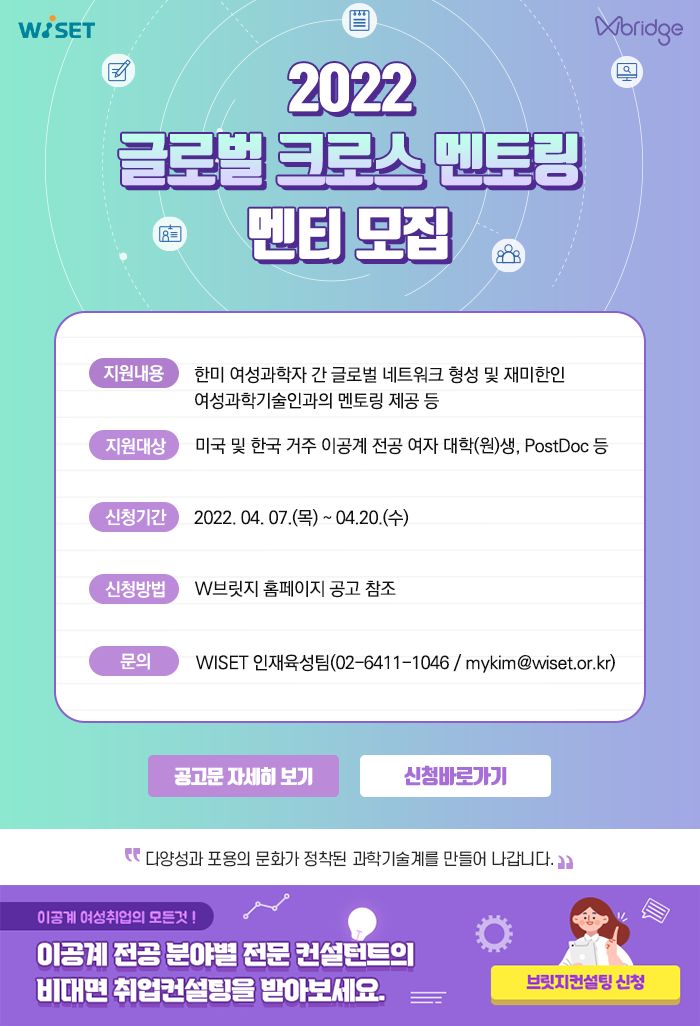 🌍❤2022년도 WISET 글로벌 크로스 멘토링 멘티 모집 ❤🌍