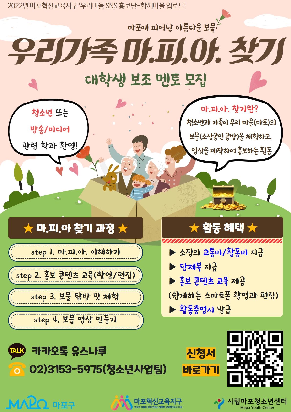우리가족 마.피.아.찾기는 청소년과 우리가족이 생각하는 마을(마포)의 보물(공방)을 체험하고 홍보영상을 제작하여 SNS를 통해 홍보하는 활동으로, 2022년 마포교육혁신지구 사업으로 선정 된 프로그램입니다!!