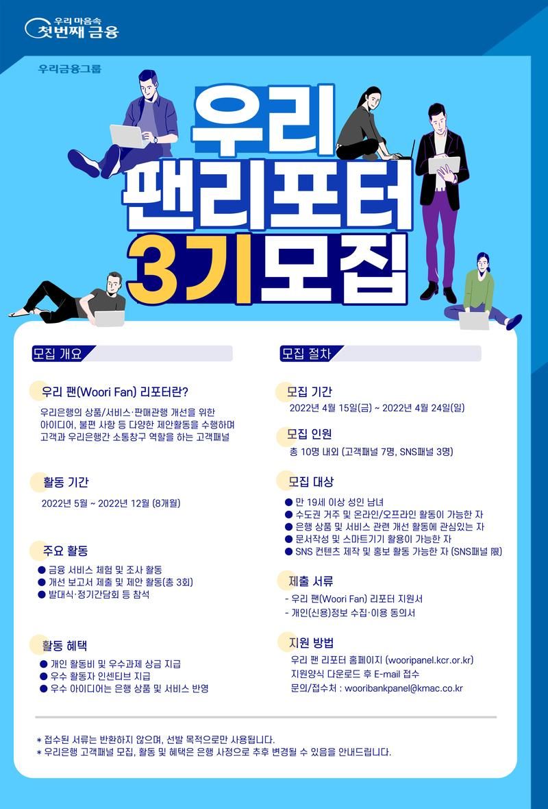 - 제출서류 : 우리 팬(Woori Fan) 리포터 지원서 및 (필수)개인(신용)정보 수집 · 이용 동의서