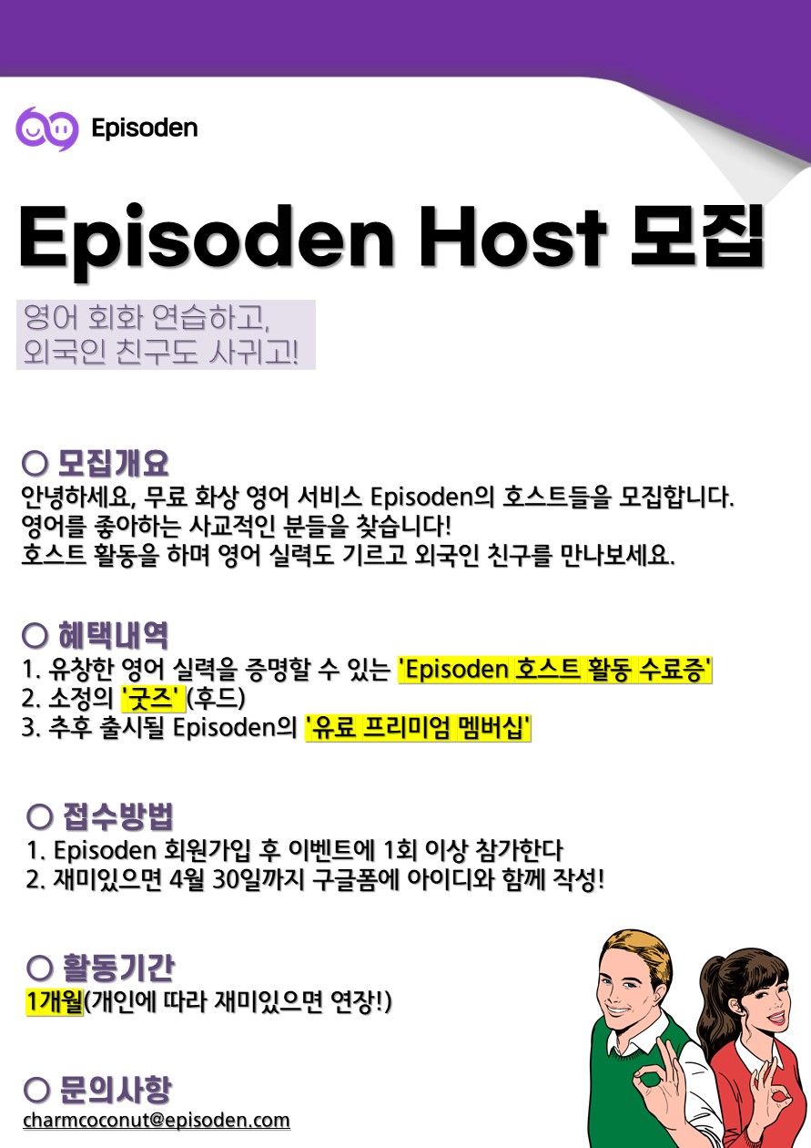안녕하세요, 무료 화상 영어 서비스 Episoden의 호스트들을 모집합니다.